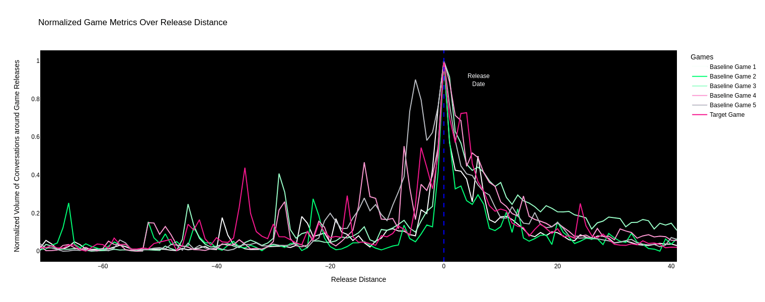 Marketers still treat game launches as if they're crucial, do-or-die events. The graph below —built using our proprietary AI tool Huge Live— represents the overlaying and normalizing of six of the top comparative games from different studios and their conversational trend lines based on the performance of these games around their respective release dates.