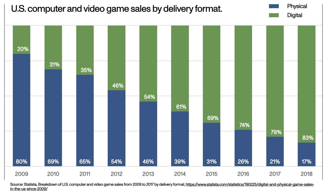 That was the norm for avid gamers when it came to blockbuster title releases. But as technology has advanced, we’ve seen a massive shift (as the graphic below shows) from 2009 to 2018 in buying behavior, from physical to digital delivery formats.